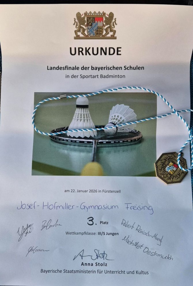 Am Donnerstag, den 22.01.2026, ist das Badminton Team des JOHO, Jungen Wettkampfklasse III S, nach Fürstenzell zur Qualifikationsrunde Süd für das Landesfinale aufgebrochen. Zum Treffpunkt für den gemeinsamen Bustransfer dorthin wurde das Team dankenswerterweise von Spielereltern gefahren (vielen herzlichen Dank dafür), und von dort ging es mit zweien unseren Gegnermannschaften zum Austragungsort.