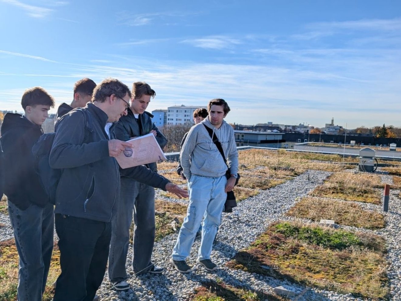 Wie das in der Praxis aussieht, konnten die Schüler direkt vor Ort erleben: Igelschubladen, begrünte Dächer, Fledermausschächte und viele weitere Elemente wurden gezielt eingebaut, um Tieren ein Zuhause zu bieten. Bei strahlendem Sonnenschein durften alle sogar das Dach der Wohnanlage besichtigen – ein echtes Highlight!