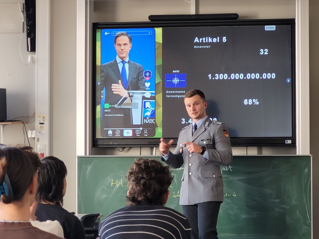 Als Hauptmann Léon Lücke am 29.10.2025 zu Gast bei den Politik-und-Gesellschaft-Kursen der Q12 war, war die neue Wehrpflicht dann natürlich doch das erste große Thema – kein Wunder, sind die Jugendlichen davon ja unmittelbar betroffen. Auch die Frage, wie (und wann) die von der Politik beschlossenen Investitionen bei der Truppe ankommen, interessierte sie. Im weiteren Verlauf der Veranstaltung standen dann aktuelle Herausforderungen für die internationale Sicherheitspolitik im Blickpunkt. So stellte Hauptmann Lücke dar, wie stark die Verteidigungsfähigkeit der NATO bisher vom Budget und Einsatzwillen der USA abhingen, und wie die anderen Mitgliedsstaaten in jüngster Zeit ihren Beitrag neu überdenken müssten. Mit zwei Einsätzen der deutschen Marine illustrierte er, wie bereits jetzt gegen Gefährdungen der internationalen Sicherheit, die gerade auch durch hybride Kriegsführung entstehen, gekämpft wird.