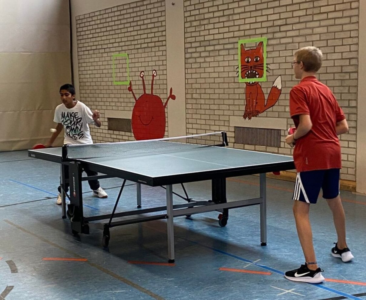 Für aktive Pausen stehen allen Schülerinnen und Schülern zahlreiche Sportgeräte wie Bälle zur Ausleihe sowie eine Boulderwand, Tischtennisplatten und weitere Bewegungsmöglichkeiten zur Verfügung. Wer will, kann sich richtig auspowern und so den Kopf für den Unterricht freibekommen.